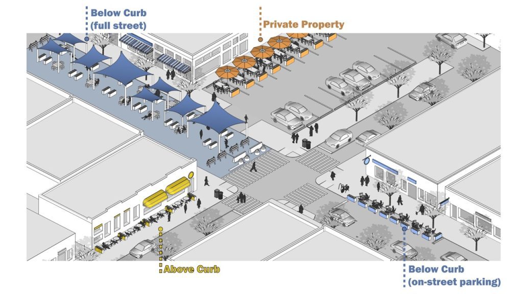 During the pandemic, cities granted restaurants regulatory relief, allowing them to expand their operations outdoors. This led to a surge in sidewalk and street dining. These outdoor dining areas provided a much-needed sense of normalcy where people were able to convene and gather like before the pandemic. Many of us have grown accustomed to dining out at a table on the side of the street—or perhaps a sidewalk. This trend—streets for people— is taking once neglected areas and turning them into spaces of liveliness and socialization.